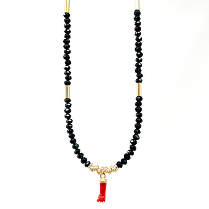 Adoptez le Collier Charlie, une pièce faite main qui allie la modernité des perles facettées, des tubes et rondelles en acier inoxydable, et l’authenticité d’un pendentif main de protection en Corail rouge de Méditerranée.